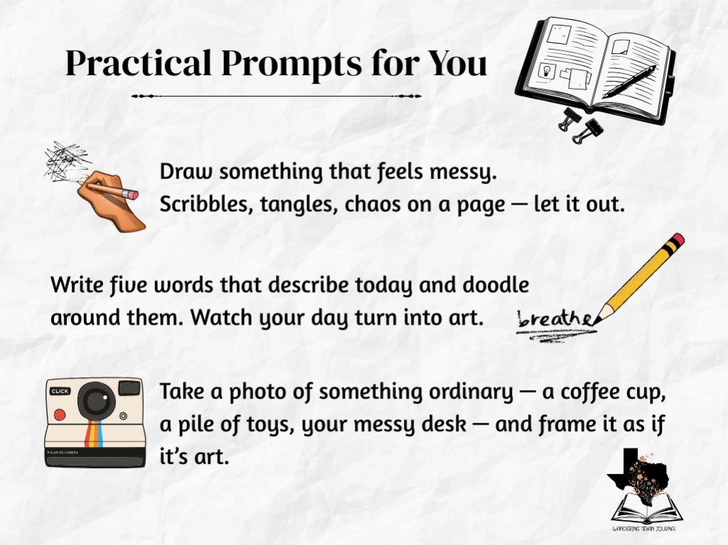 Remember, creativity is not about being constantly perfect or doing that one thing you think you’re good at, all the time. It’s about finding your way, one mark, one word, one spark at a time. Think of it as a compass pointing you toward calm, even when the road feels bumpy, muddy, and unclear.